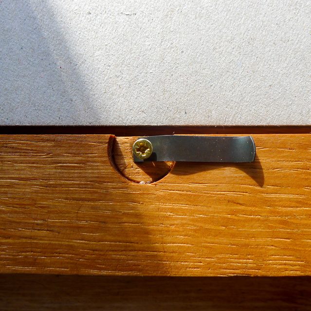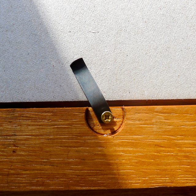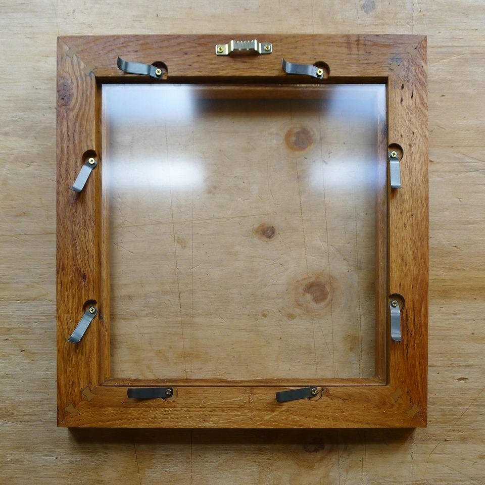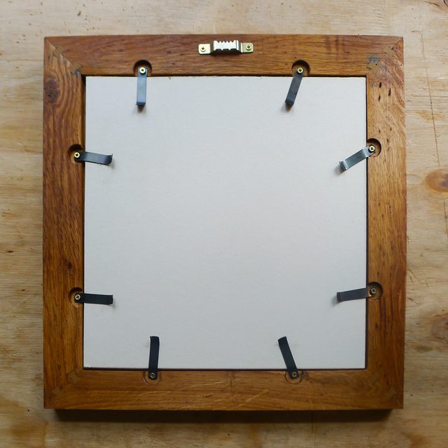 Als Rückwand benutze ich stabilen Karton. Dieser wird durch mehrere Stahlreiber im Rahmen fixiert. Durch drehen der Befestigung kann der Rahmen leicht geöffnet werden und das Bild eingesetzt werden.