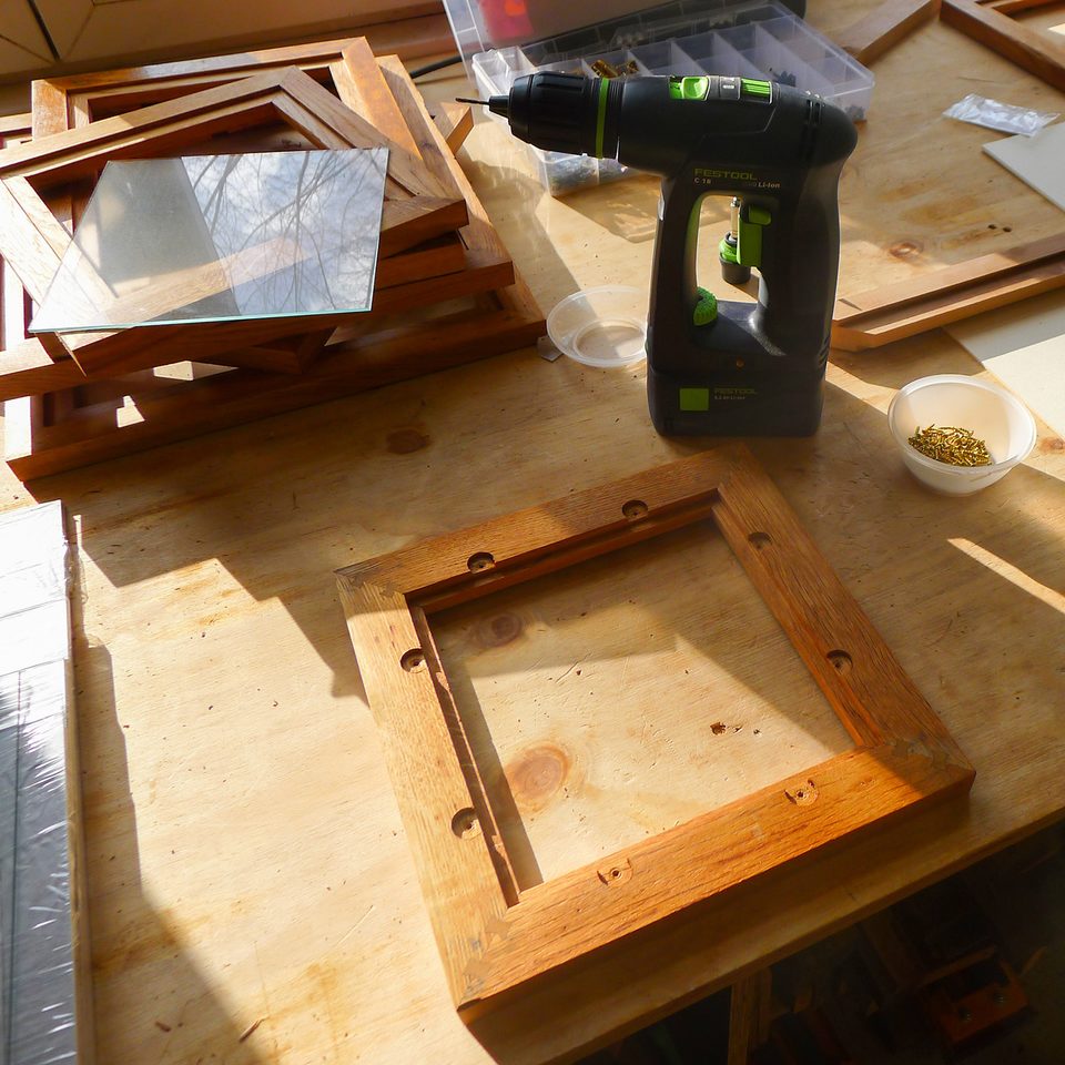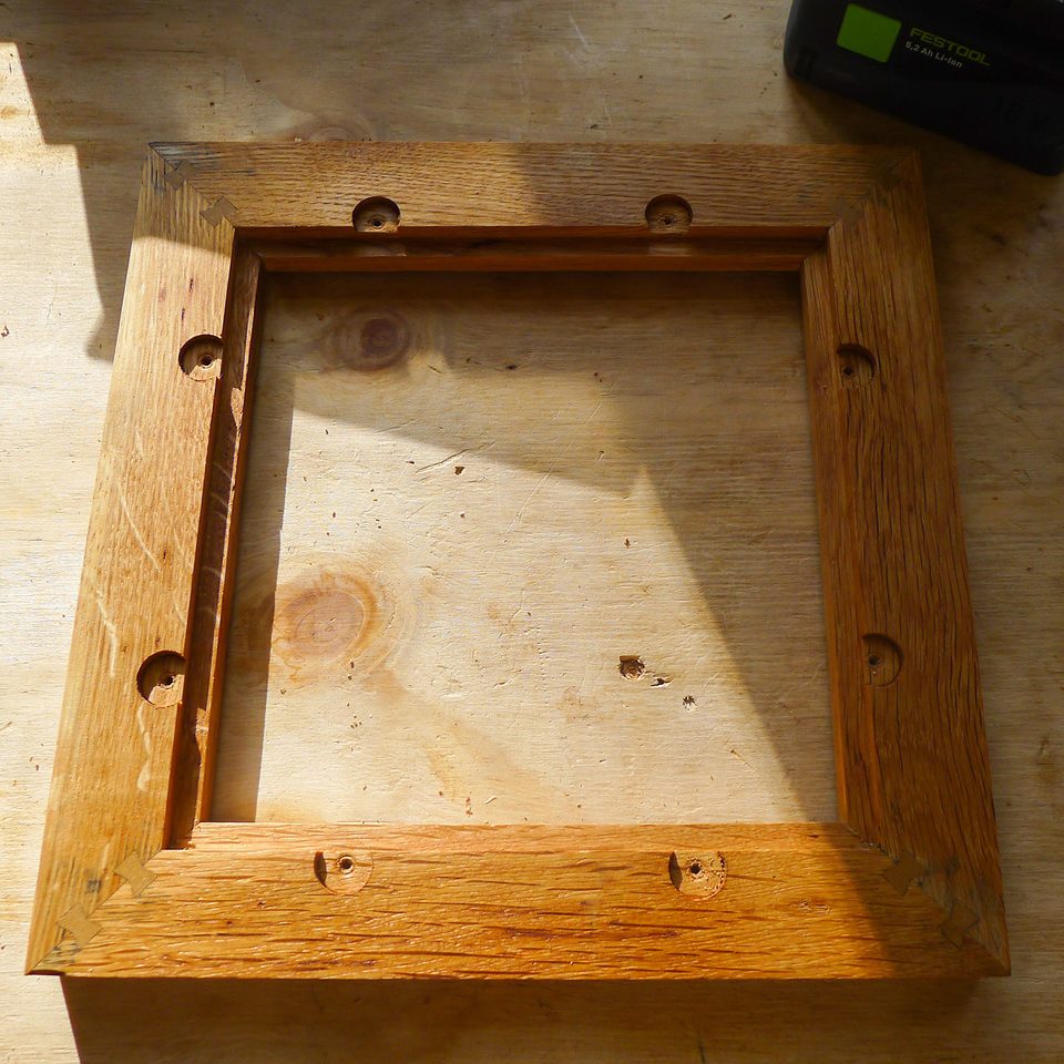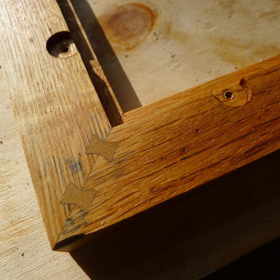 Alle meine Hölzer werden auf 7-10 % Holzfeuchte getrocknet. Das garantiert das die Rahmen auch bei trockener Luft in Form bleiben. Die einzelnen Leisten werden mit einer stabilen Schwalbenschwanzverbindung zusammengefügt.